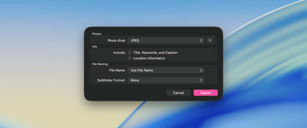 For photo files, for example, you can select the file in the Photos app, click on File > Export, and then uncheck the Include: Location Information option to remove GPS location data. This will give you a somewhat more private version of the photo file to share.