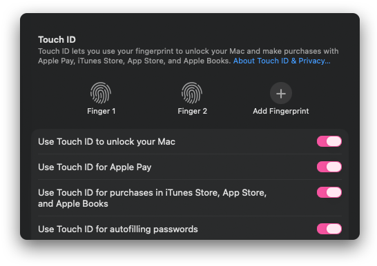First things first. To use passkeys on a Mac, you have to have Touch ID set up. If you haven’t done this, it’s very easy—just head to System Settings > Touch ID & Password > Add Fingerprint, and follow the prompts.