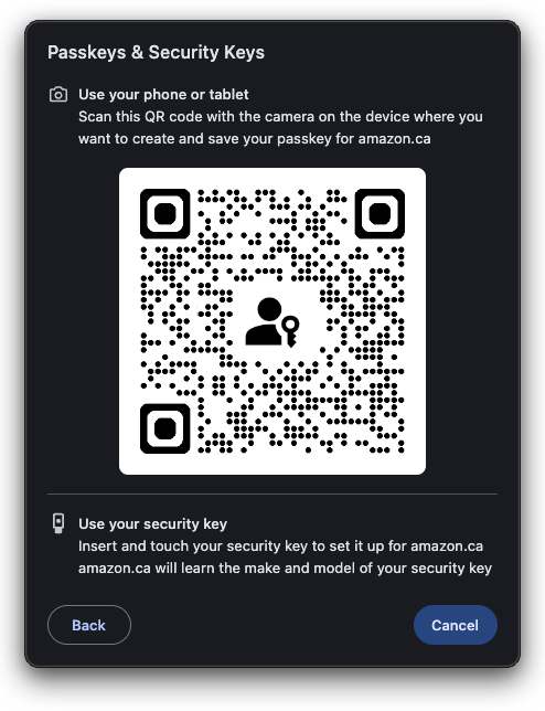 1. Log into a site that offers support for passkeys using your password (e.g., Amazon.com). You can find a list of sites that support passkeys at the FIDO Alliance website.