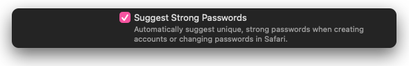We say “if” because not every website supports passkeys just yet, so for some sites you’re still going to have to use a password. These should always be strong, unique, and random. The Passwords app can create and store such passwords for you if you ask it to. Just open the app, go to Passwords > Settings. Check Suggest Strong Passwords and your Mac will prompt you to let it create a strong password every time you save a new login or change an existing password.